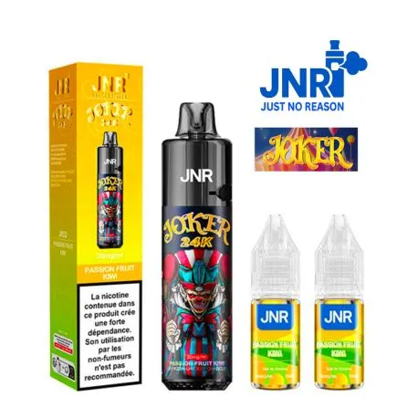 La JNR Joker 24K est une puff rechargeable disponible à 15,99€ sur eliquide-pas-cher.fr. Ce kit inclut la puff et les fioles d'e-liquide aux sels de nicotine 20mg/ml – saveur Fruit de la Passion Kiwi.